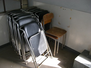 なぜか踊り場に学校椅子がたくさん。なぜ!?